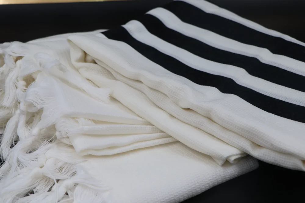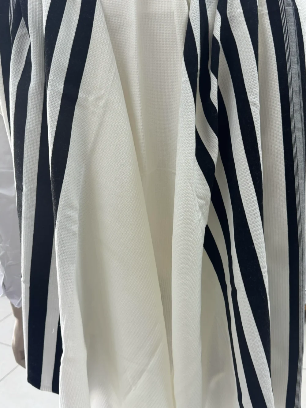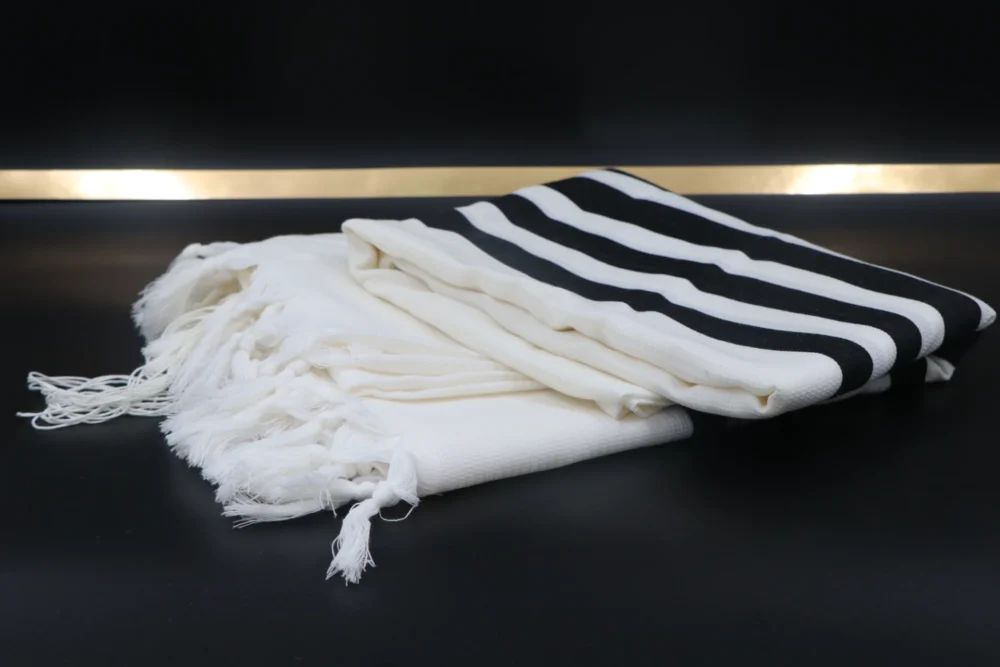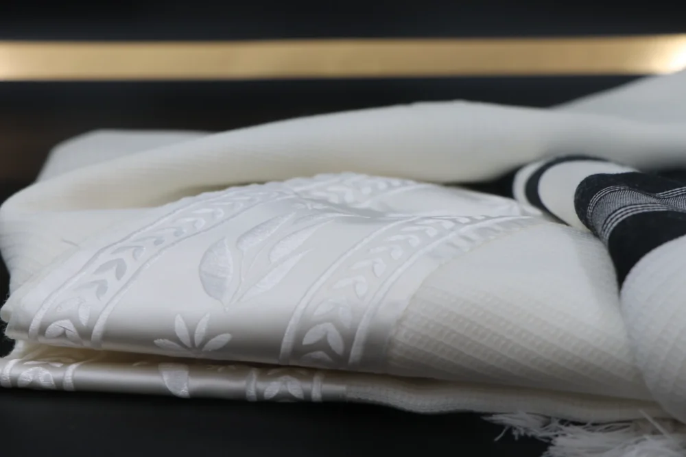 טלית 100% צמר רחלים פסים בצבע שחור ועטרה לבנה תואמת בדוגמת עלים