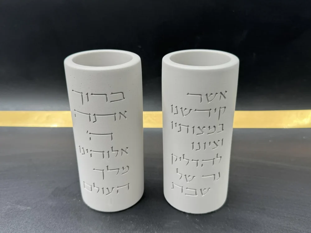 זוג פמוטים בטון מעוצבים עם ברכת הדלקת נרות חרוטה במראה יוקרתי שמהדר את השבת.