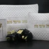 הערכה כוללת: תפילין בהמה גסה דגם 'מלכות', טלית חתנים, כיסויים לתפילין וטלית + רקמות שם, סידור + הטבעה וכיפה העשוייה מעבודת יד.