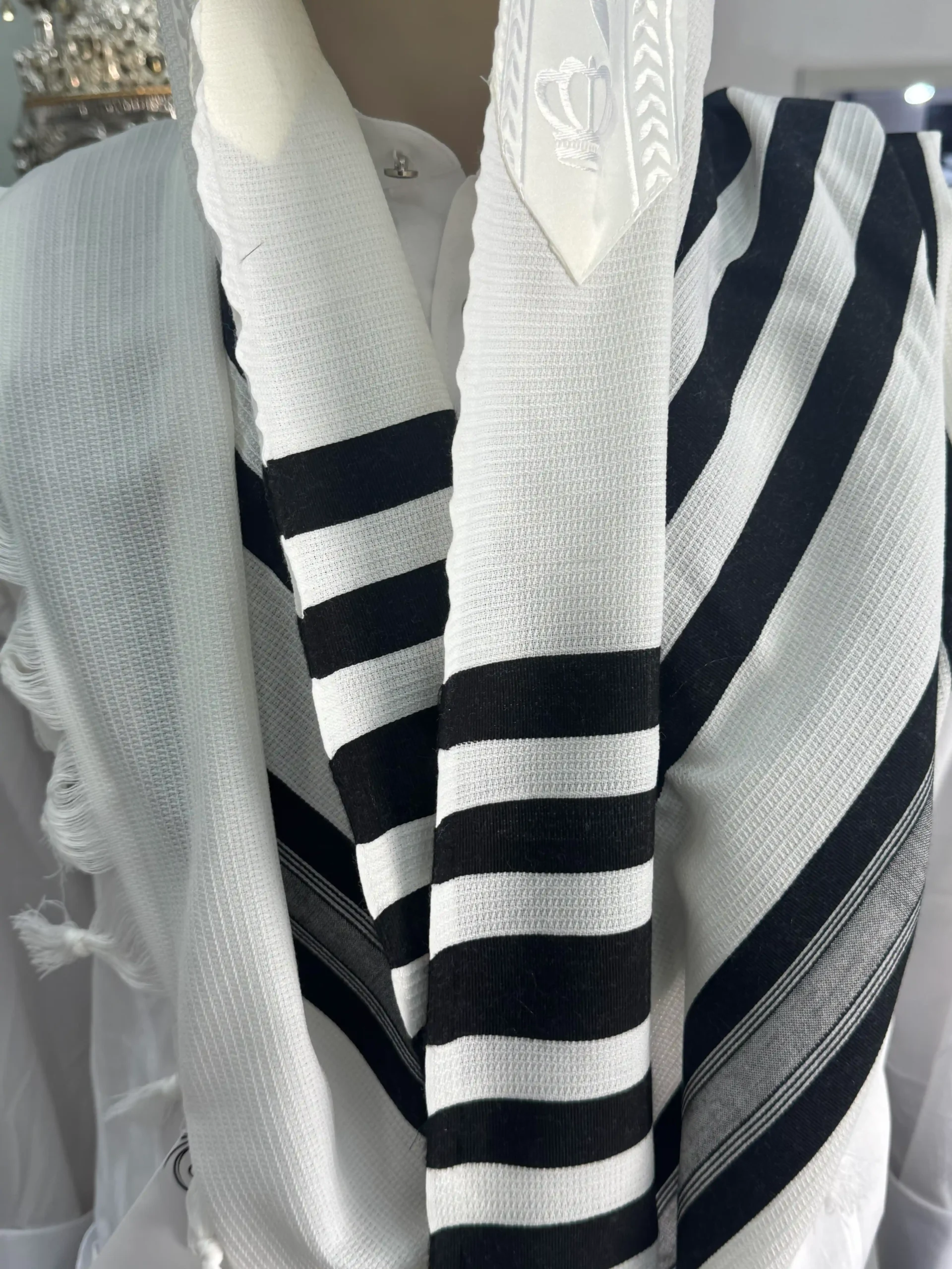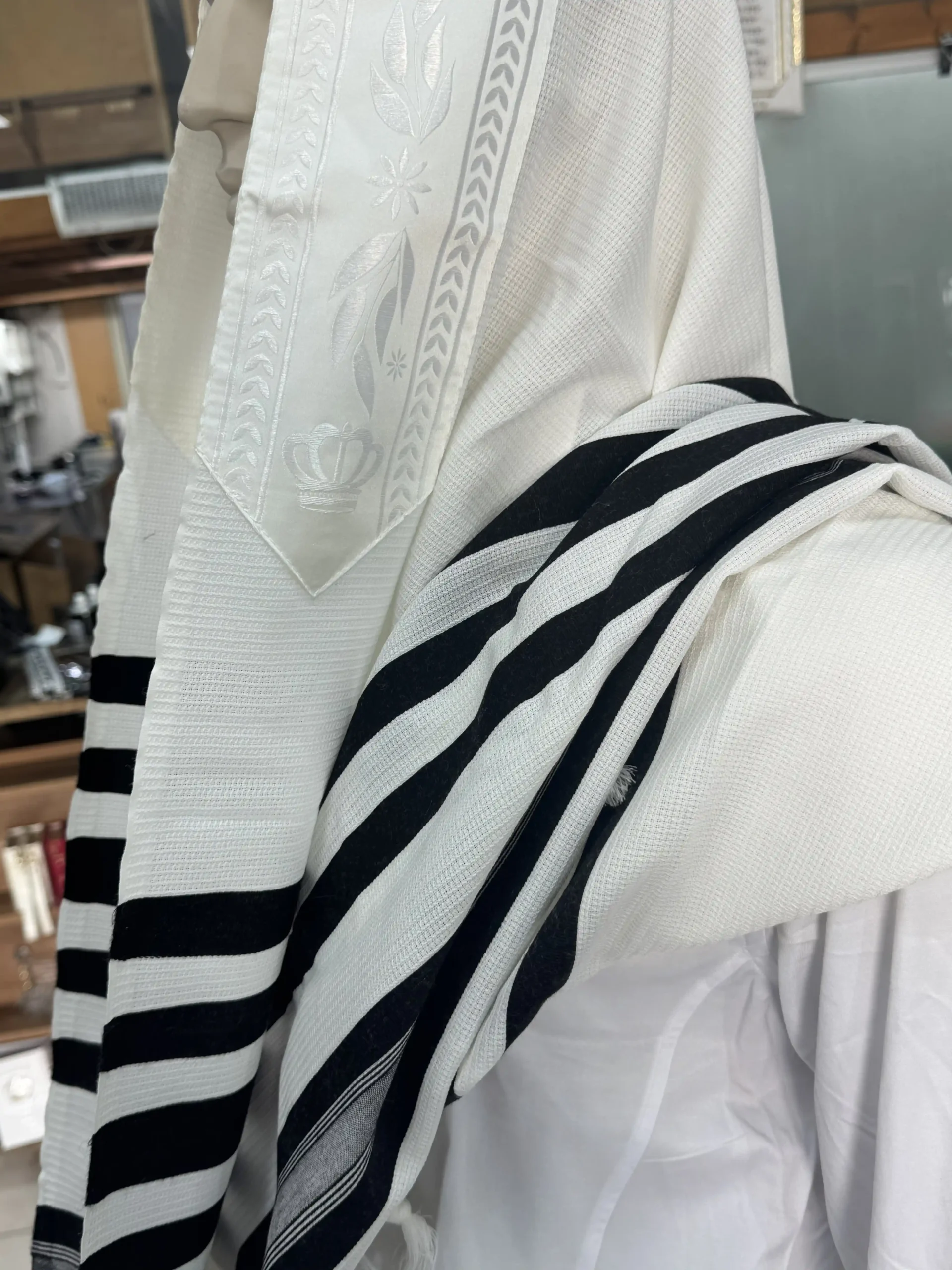 טלית 100% צמר רחלים פסים בצבע שחור ועטרה לבנה תואמת בדוגמת עלים