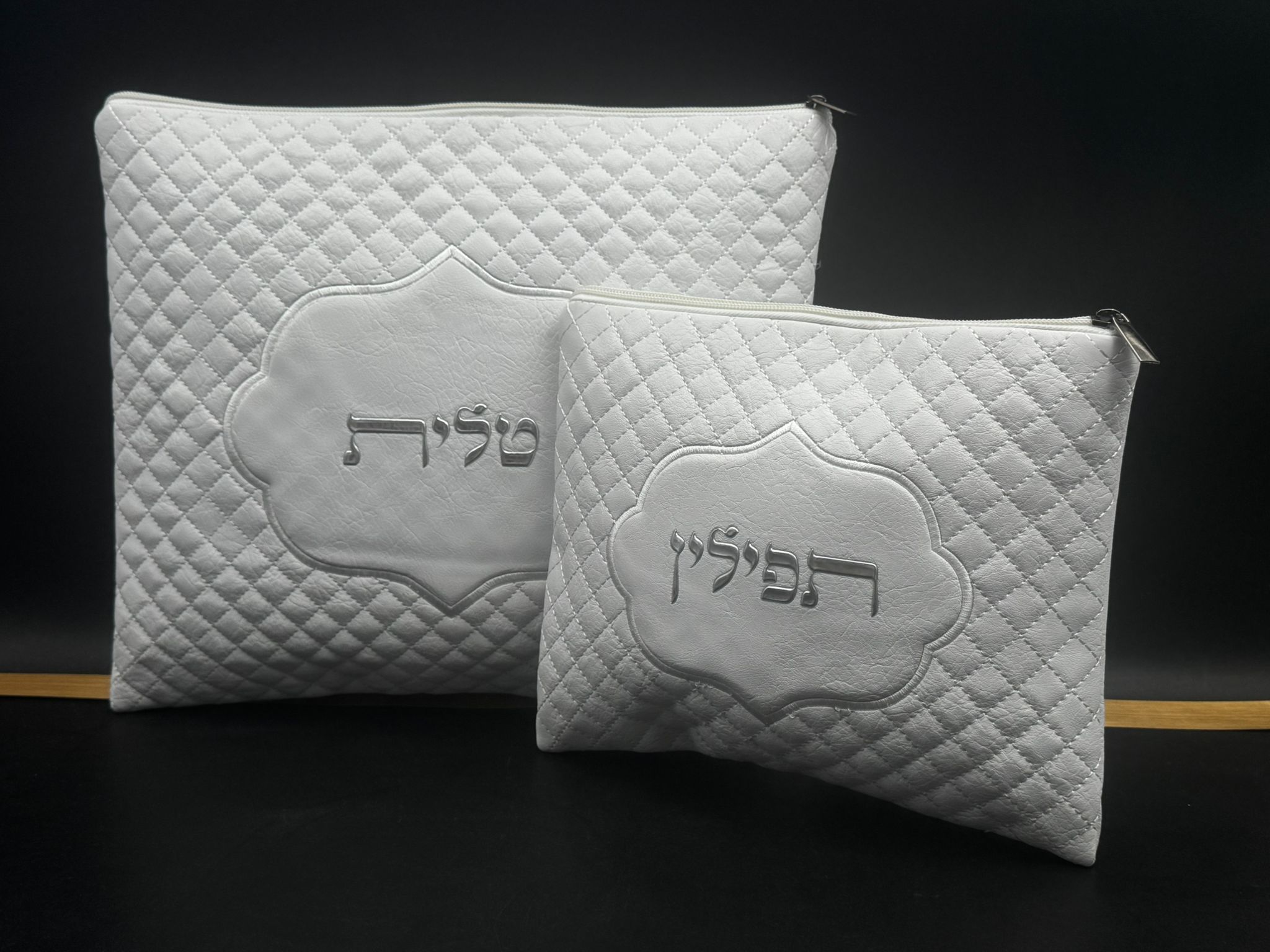כיסוי טלית ותפילין דמוי עור לבן דגם משבצות בעיצוב יוקרתי עם טס מובלט בצבע כסף. מעניק מראה אלגנטי ושומר על קדושת הטלית והתפילין לאורך זמן.