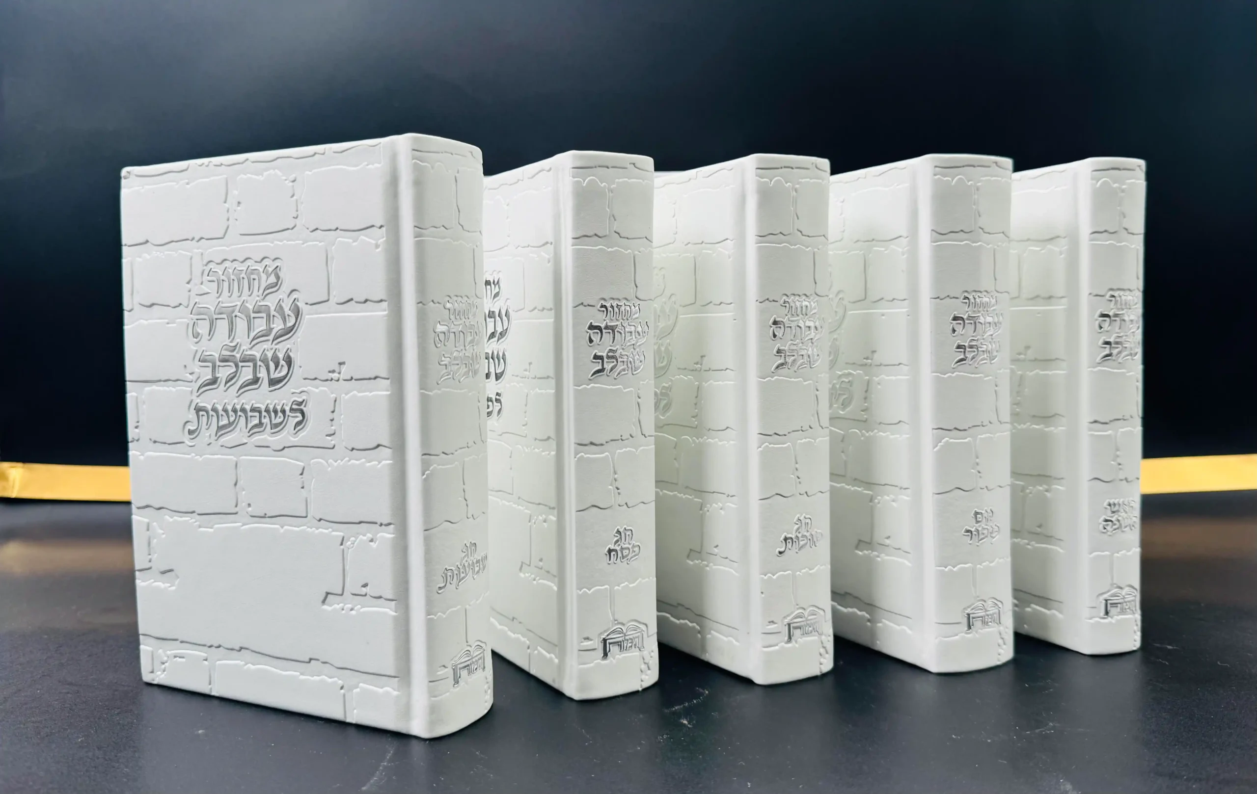 סט מחזורים "עבודה שבלב" מפואר בצבע לבן עם כיתוב זהב מובלט, דמוי עור עם איור של אבני הכותל.