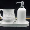 סט נטלה וסבונייה מהודר עשוי פולריזן איכותי, בעיצוב אלגנטי וקווים מודרניים. הסט כולל נטלה, סבונייה ומגש תואם, היוצרים מראה אחיד, מסודר ומכובד לפינת נטילת ידיים.
